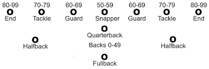 2. At the snap, at least five players wearing jerseys numbered 50 through 79 are on the offensive scrimmage line and no more than four players are in the backfield (Rules 2-21-2, 2-27-4 and 7-1-4-a) (Exception: Rule 7-1-4-a-5). (A.R. 7-1-4:IV-VI)